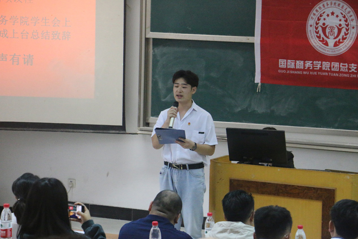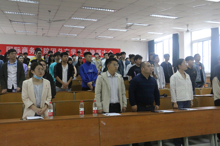 9月23日下午,国际商务学院团总支第二届换届大会在3201教室举行,校团委书记司斌斌书记,校团委周莹老师,国际商务学院党支部书记汪慧书记,国际商务学院学工助理黄吉胜老师、辅导员吕欣欣老师及各分院学生会,大学生记者团,校卫队,社团联合会以及国际商务学院各班级同学参加了此次大会。