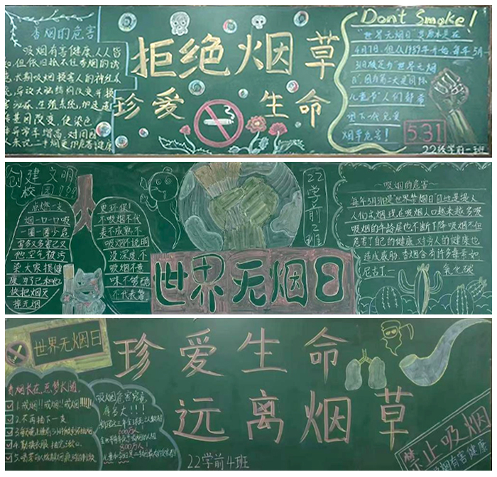 2023年5月31日是第36个“世界无烟日”,主题为“无烟,为成长护航”。为共创绿色、洁净、文明的无烟校园,近日,音乐教育学院开展了以“世界无烟日”为主题的班会和班级黑板报。